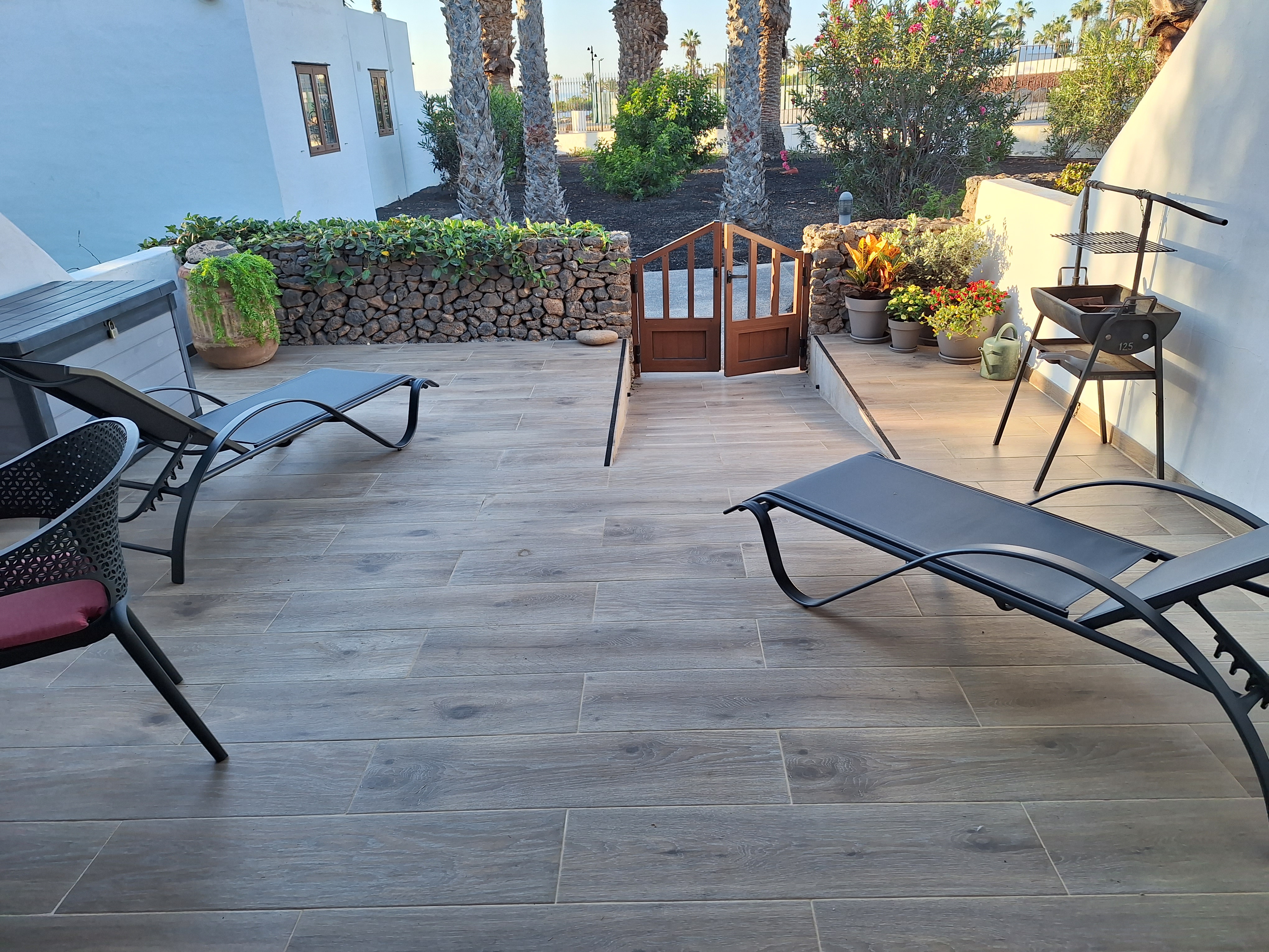 The new patio has a table and four chairs, an easy chair, two sunbeds and parasol.