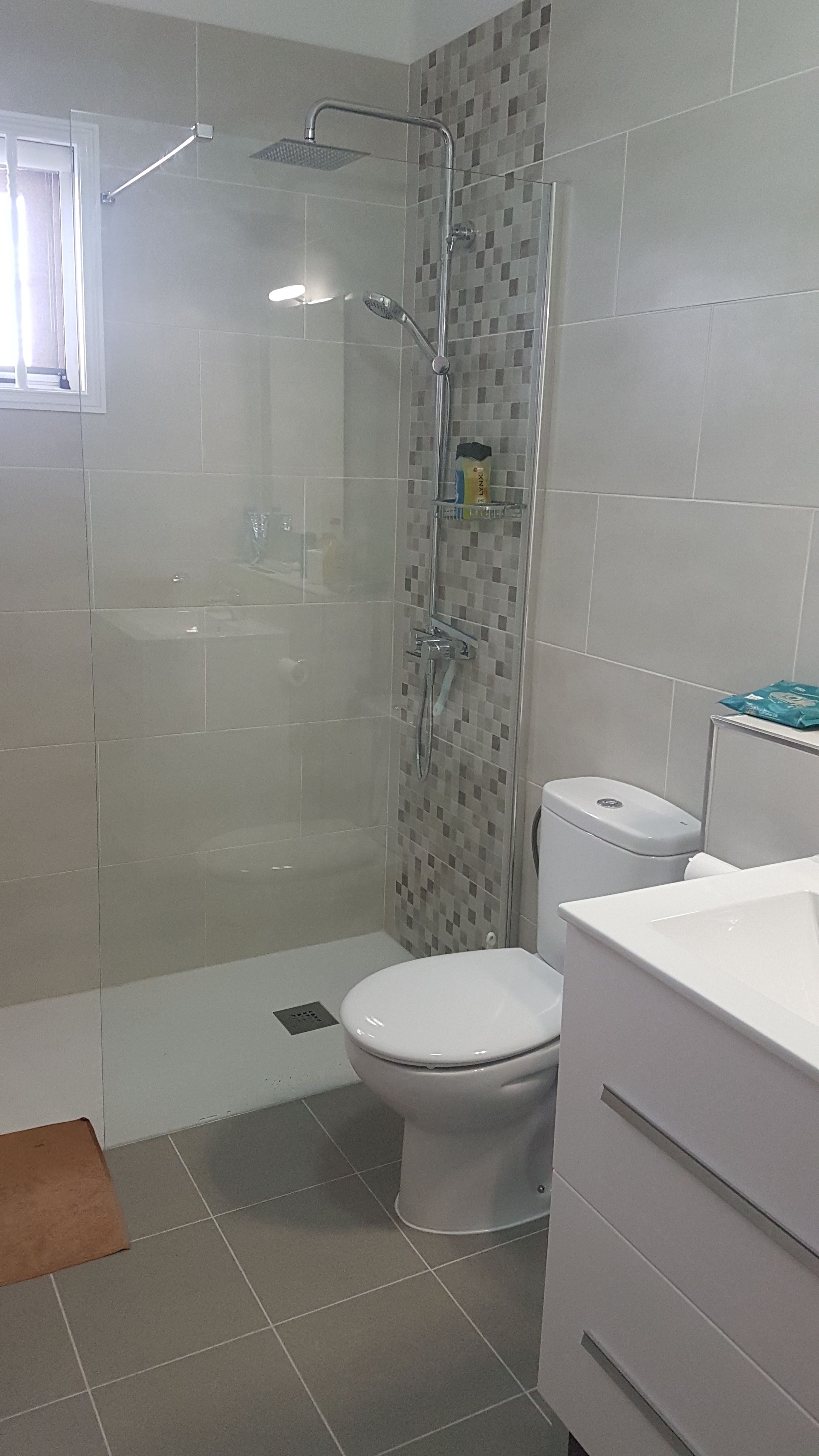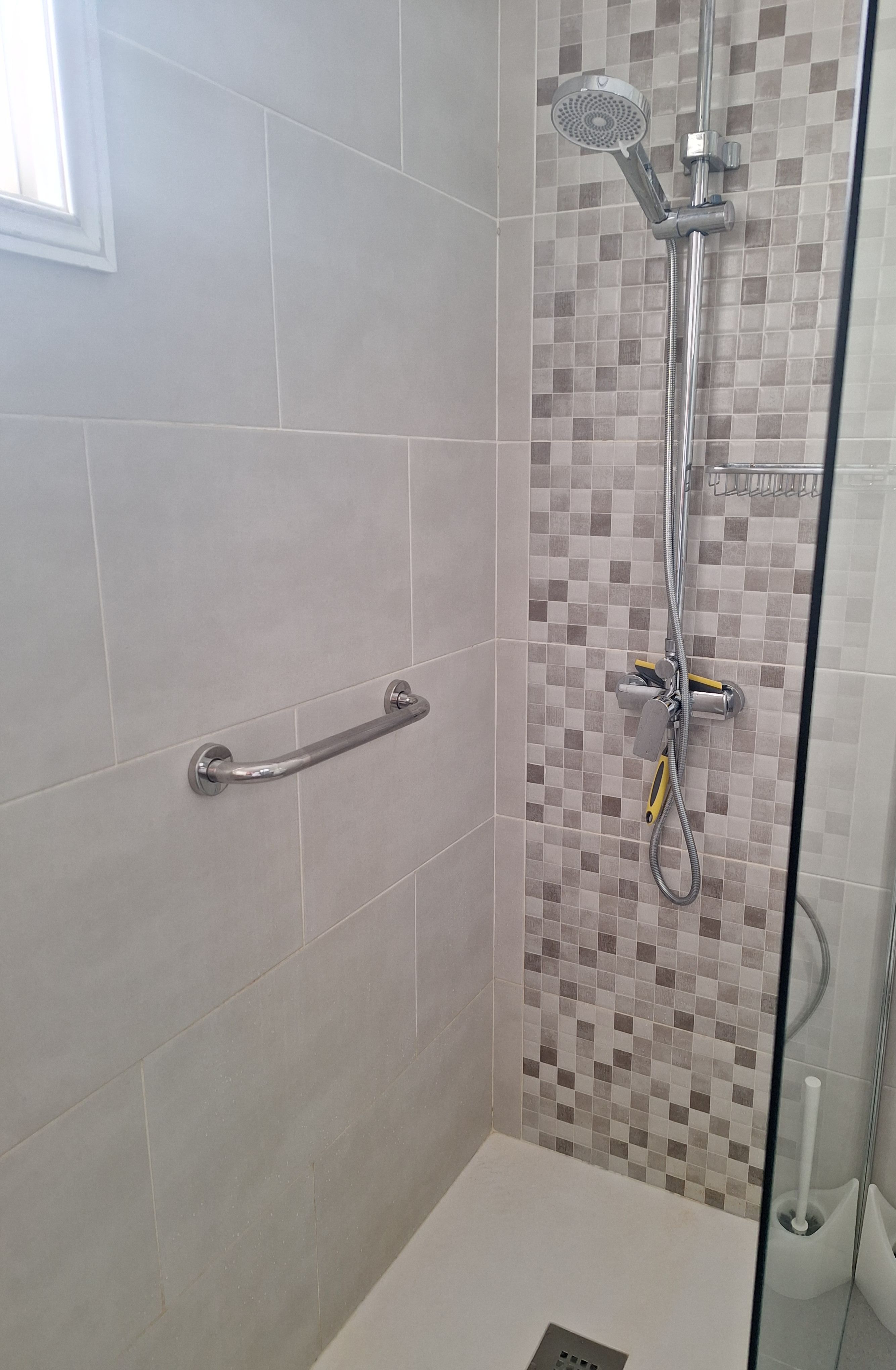 The bathroom includes a walk-in shower with grab rail, toilet, vanity unit and mirror. Bath towels and toilet paper are provided, green swimming pool towels are available from reception. If you are staying longer than a week there will be a change of towels, bed linen and cleaning each week.